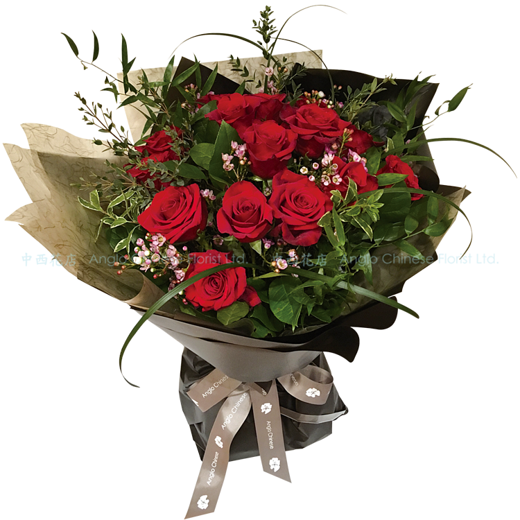 Classic Large-size red rose, waxflower chamelaucium, mix of seasonal foliage including italian ruscus aculeatus, eucalyptus mini, salal and more.
