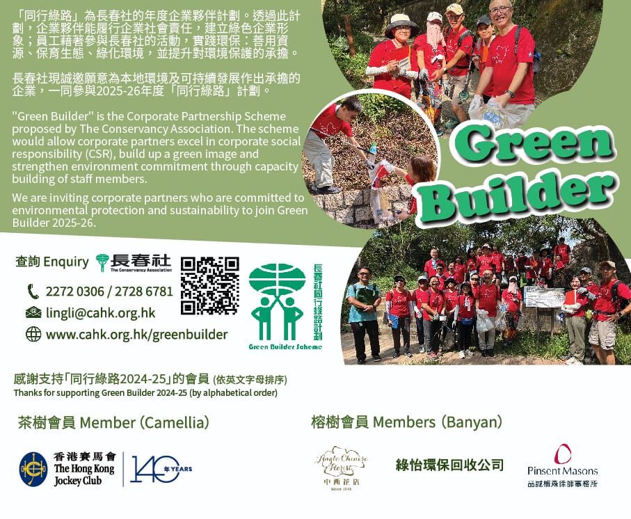 Countryside clean-up included hike and remove trash, take record and sort out recyclables, share your countryside cleaning experience and the message of “Bring Your Own Rubbish Home” to contribute for the sustainable development of Hong Kong with The Conservancy Association.