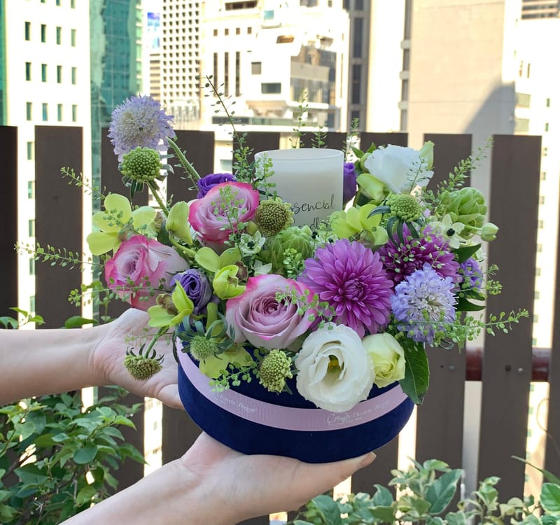Dahlia, rose, seasonal flowers in box + Beeswax candle Blended with 100% Pure Essential Oil