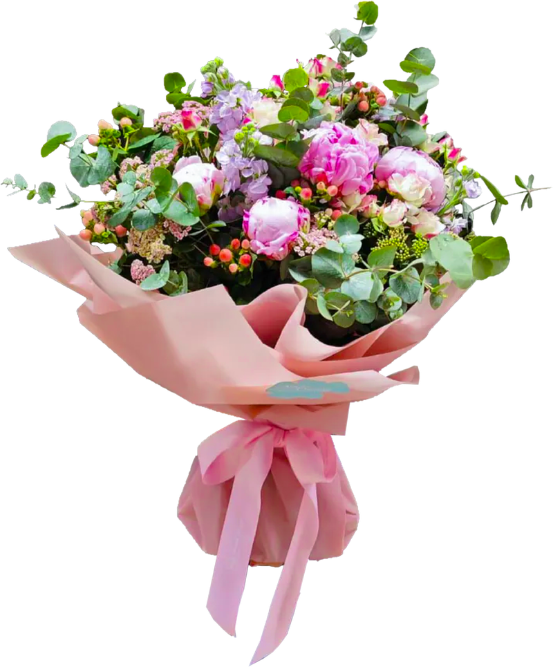 Pink peonies, lilac matthiola and assorted flowers in matching soft and graceful colour.