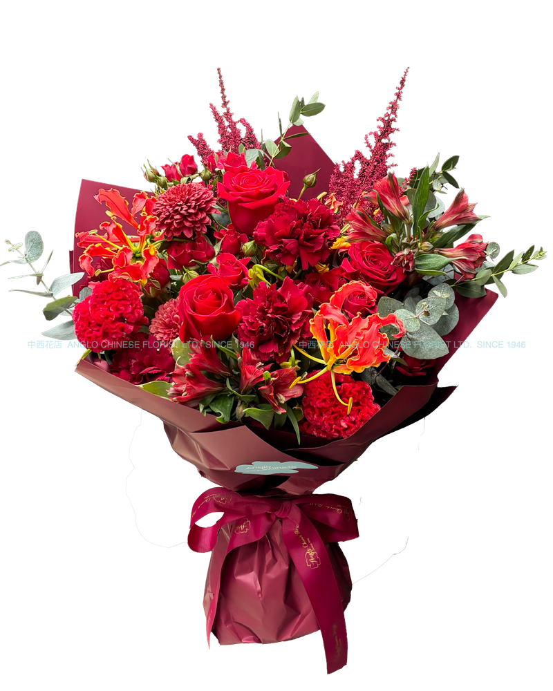 Arranged and hand-tied. Wrapped with paper and ribbon.